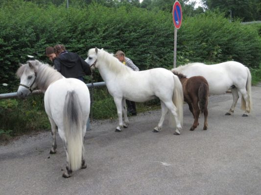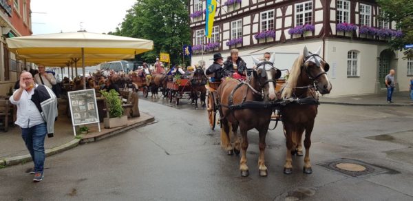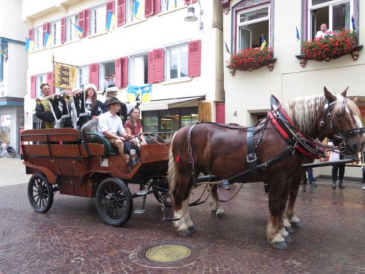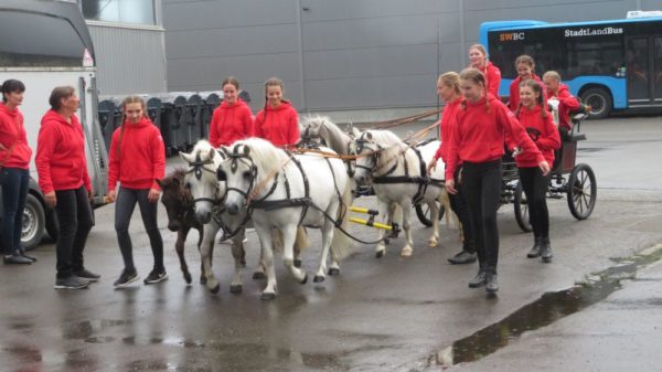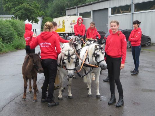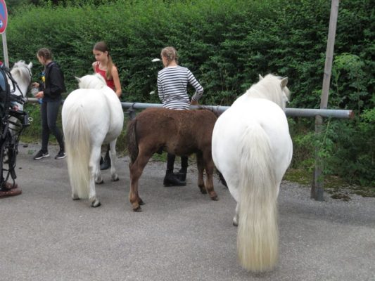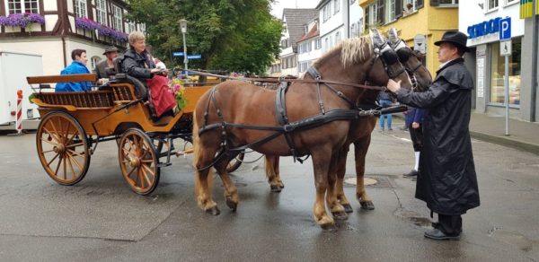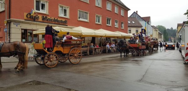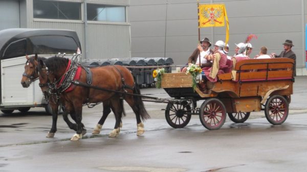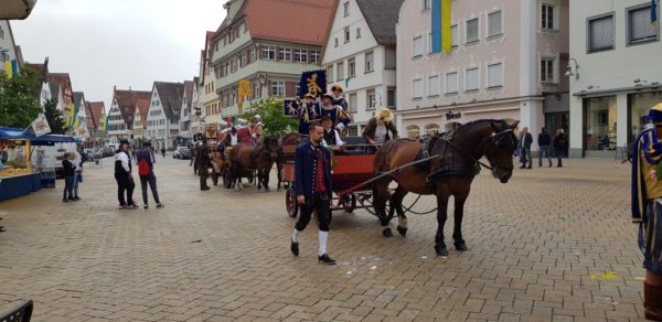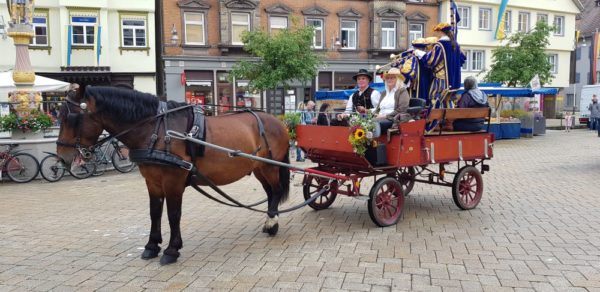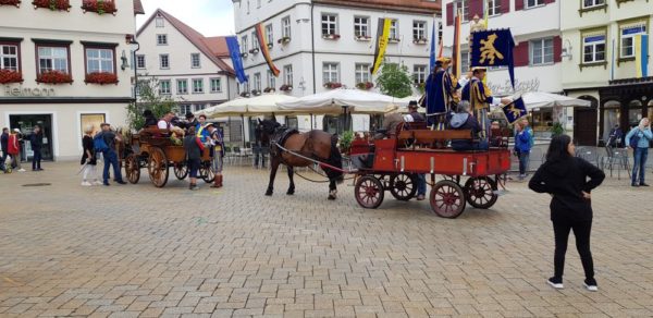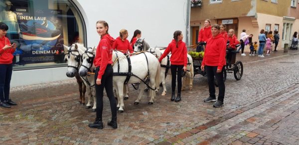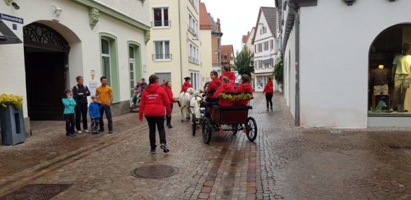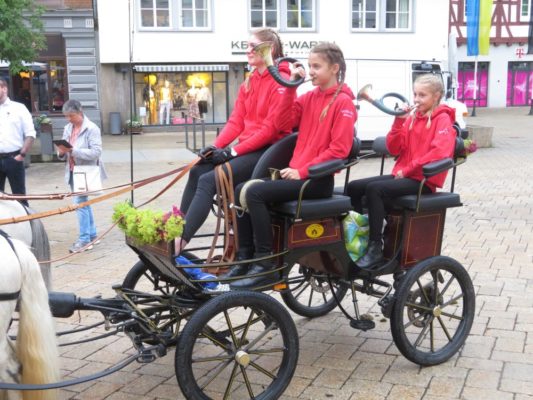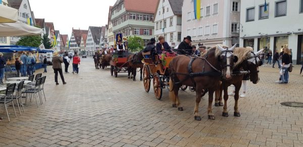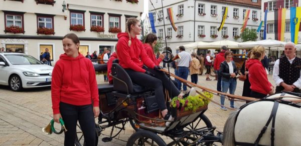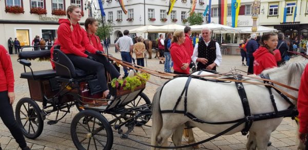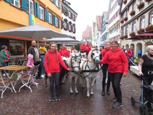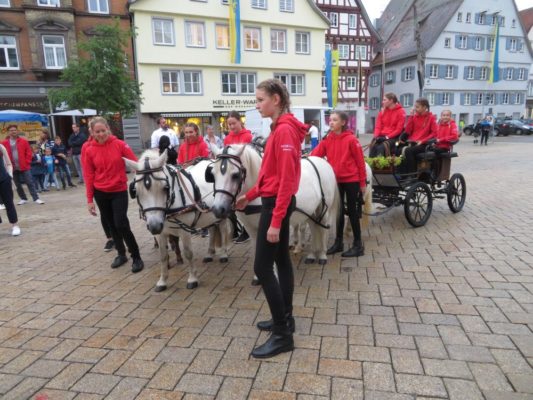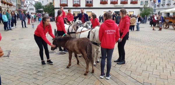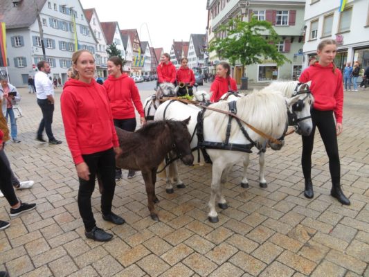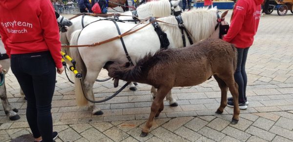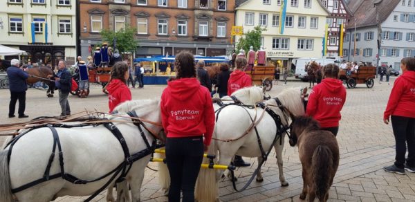 Gnug isch gnug! Die Biberacher haben eindeutig genug von ‚Pandemie‘ und ’nicht feiern dürfen‘ und bei ‚Schütza‘ hört der Spaß sowieso auf! Viele sind mittlerweile geimpft, die Inzidenzen sind niedrig und die Schützendirektion hat in Kooperation mit der Stadt ein gutes Konzept ausgearbeitet, wie die Biberacher wenigstens etwas Schützen-Feeling bekommen können – denn eines dürfte jedem klar sein, die Biberacher lassen sich ihr Schützenfest nicht nehmen! … und die Ponyfreunde mit ihren Schützenponys natürlich auch nicht. Als eine der Live-Aktionen war auch ein unangekündigter Mini-Umzug einiger Kutschen durch Biberach geplant. Die ‚großen‘ ein- und zweispännig gefahrenen Kutschen waren besetzt mit einigen Schützendirektoren und mit einer Auswahl an Fanfarenbläsern, die an den unterschiedlichsten Plätzen der Biberacher Innenstadt kleine Ständchen spielten. Auch unser Ponyteam war mit einem Vierspänner und Posthörnern vertreten, die man mal hier und mal da in der Innenstadt zu hören bekam. Unsere Ponys und ihre Fahrerin Magdalena, eine der ‚Großen‘ des Ponyteams, haben ihre nicht immer ganz einfache Aufgabe ganz super gemeistert und wurden vor allem von den Kindern begeistert bejubelt. Auch eines unserer Fohlen durfte mit und wurde natürlich besonders bestaunt.