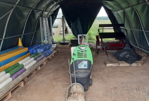 Unser zweites Ziel war das Aus- und Aufräumen des Unterstands, in dem neben den Hindernisstangen und -ständern künftig auch die beiden Kutschen stehen sollen, mit denen das Ponyteam mit den Ponys das Kutschefahren trainiert und natürlich auch die Jungtiere an der Kutsche ausbildet, nicht zuletzt auch für Schützen. Zwar fällt leider dieses Jahr das Schützenfest aus, aber wir sind zuversichtlich: das nächste Schützen kommt bestimmt und wir wollen dafür gewappnet sein. Und da die Kutschen in der Nähe der Ponys sein und natürlich auch geschützt stehen sollten, nahmen wir das Angebot der Familie Zell dankend an, uns den Platz für die Kutschen sozusagen selber zu ‚erarbeiten‘.