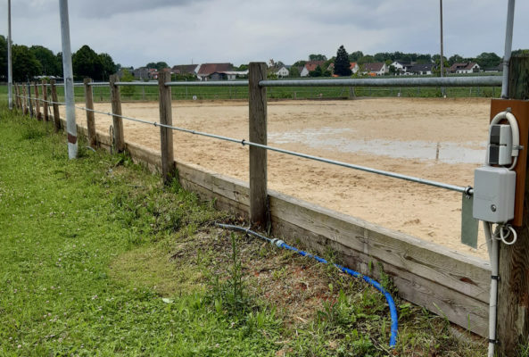 Da die Sicherheit unserer kleinen Reiterinnen Vorrang vor allen anderen Belangen hat, haben wir zuerst eine zweite Stange zwischen Boden und Reitplatzabsperrung angebracht. Bisher gab es hier zwar keinerlei Probleme, aber wir möchten natürlich für die Zeit, wenn auch absolute Anfänger auf den Ponys das Reiten lernen, dies für die Anfänger so sicher als möglich herrichten. Bislang war zu befürchten, dass die Ponys mit Reitern, die noch wenig Einwirkung auf die Ponys haben, den Verlockungen der nahen Wiese evtl. doch mal nachgeben und unter der Reitplatz-Absperrung durchlaufen. Die Ponys passten bisher durch, aber die Kinder würden natürlich an der Absperrung hängenbleiben, war zu befürchten. Durch die zusätzliche Stange auf halber Höhe ist dem jetzt Vorschub geleistet und wir sind auch für Anfängerstunden gewappnet, die regulär nach den Sommerferien beginnen sollen.