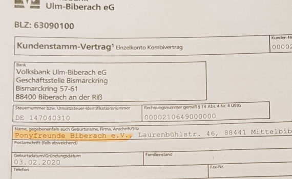 Am 11.2.2020 bekamen wir vom Finanzamt Biberach unsere Gemeinnützigkeit bestätigt und dürfen damit Spendenquittungen ausstellen und am 19.2.2020 wurde wir in das Vereinsregister beim Amtsgericht Ulm unter der Nummer VR 721742 eingetragen und dürfen künftig den Zusatz ‚e.V.‘ führen.