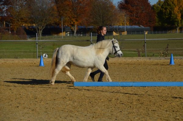 An dieser ersten Praxisstation wird eine Dreiecksvorführung und ein Bodenarbeitsparcours absolviert. Bei diesen Übungen müssen die Teilnehmer darauf achten, die Sicherheits- und Unfallverhütungsaspekte zu beachten. Ein besonderer Fokus wird hier auf die Kommunikation der Teilnehmer mit dem Pony beim Führen gelegt.
