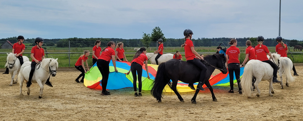 Korrektur der Ponys am langen Zügel unter Anleitung der Großen und der Team-Betreuer