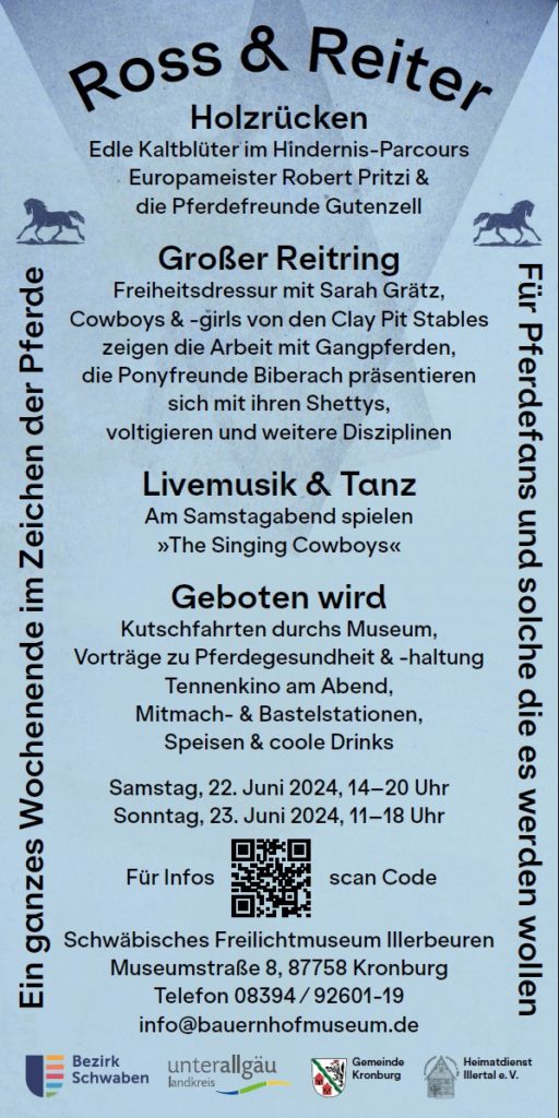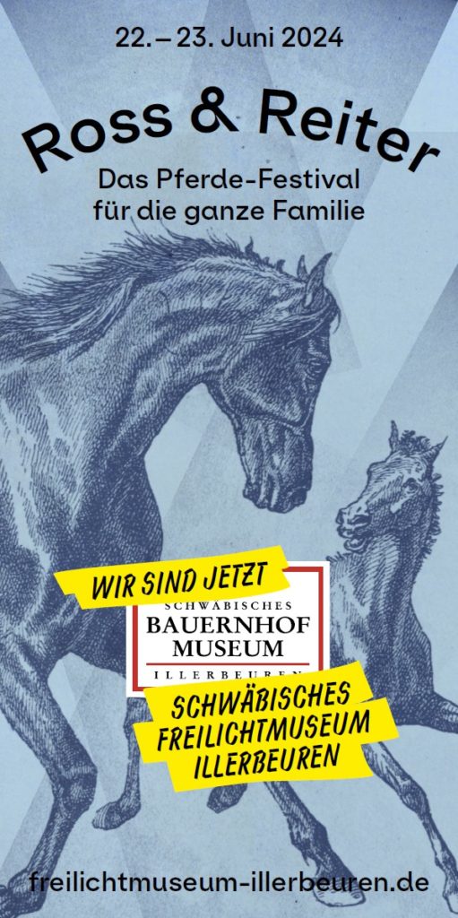 Frei nach dem Motto „Das Glück dieser Erde …“ bot das Schwäbischen Freilichtmuseum Illerbeuren am 22.06.24 von 14 bis 20 Uhr und am 23.06.24 von 11 bis 18 Uhr ein buntes Programm um die vielseitigen Vierbeiner. Mit der Ross & Reiter wollte das Museum nicht nur historische Pferderassen ins Bewusstsein rücken, sondern auch auf den gesellschaftlichen und therapeutischen Wert des Pferdes aufmerksam machen. Ob zum Arbeiten oder als Freizeitbegleiter, Pferde faszinieren seit Jahrhunderten.