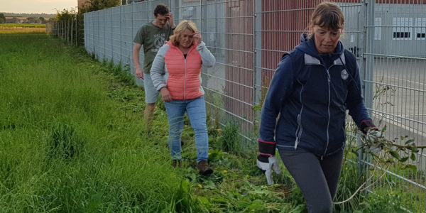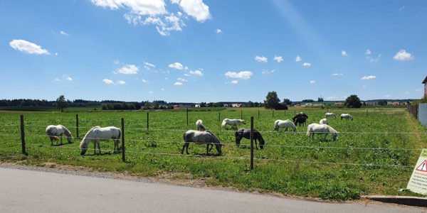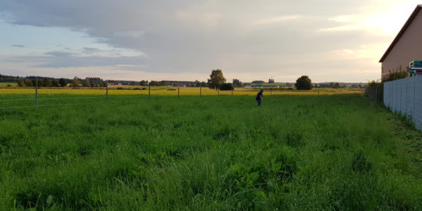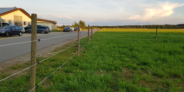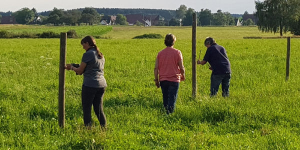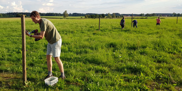 Vielen Dank an Familie Zell für die schöne Weidefläche und die umfangreiche Vorarbeit die Zaunpfähle in den Boden zu rammen. So mussten wir nur noch, bewaffnet mit Akku-Bohrmaschinen und den entsprechenden Aufsätzen, die Isolatoren (in 3 Reihen von 40 / 80 / 120 cm Höhe) in die Holzpfähle schrauben und das Band danach spannen. Unsere allereifrigsten Helfer haben auch gleich noch angefangen Unkraut zu ziehen.