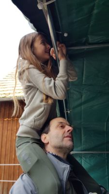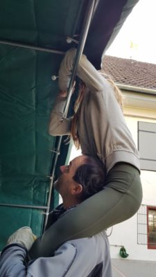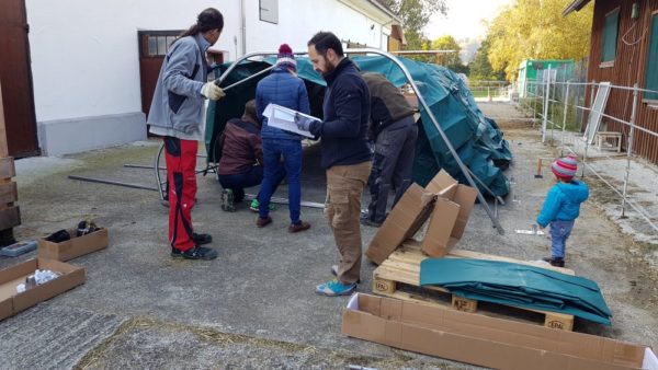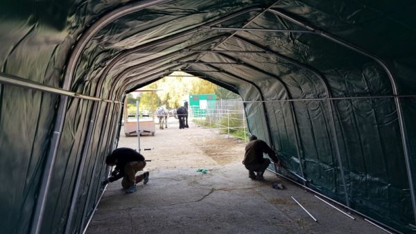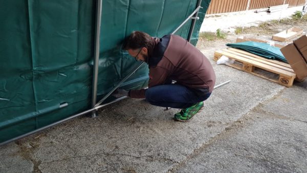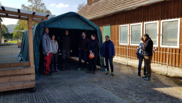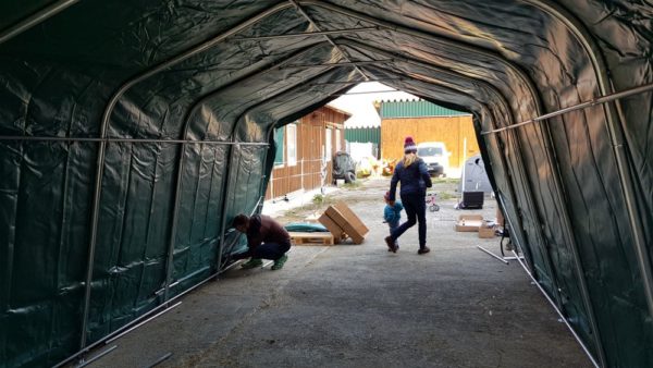 Wir hatten 4 Anbieter in der engeren Auswahl und haben uns dann einstimmig für das Modell entschieden, welches wir auch gleich am nächsten Tag bestellt haben. Drei Tage später wurde das Zelt geliefert und am darauffolgenden Samstag von unseren immer fleissigen Helfern bei einem Arbeitseinsatz ab 10 Uhr Vormittags aufgestellt. Ein Weg zum Baumarkt, um Schrauben und Dübel für die Verankerung im Betonboden auch noch gleich zu veranlassen, eingerechnet stand das Weidezelt gegen 14 Uhr.